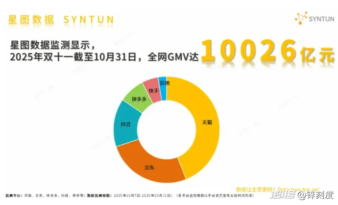 截至10月31日,2025年双十一大促全网累计销售额达到10026亿元人民币,天猫仍居综合电商平台榜首位置,京东紧随其后,抖音位列第三。