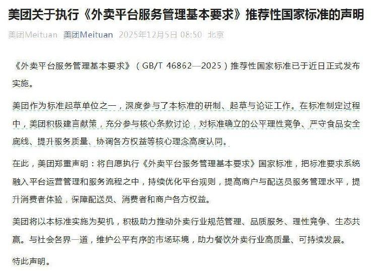 近日,淘宝闪购、美团、京东外卖相继发布执行《外卖平台服务管理基本要求》推荐性国家标准的声明。