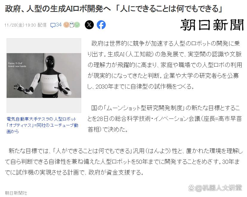 《朝日新闻》28号消息显示,日本政府似乎准备继承或重启Asimo在人形机器人领域未完成的事业。该计划汇集了企业、大学和其他机构,共同开发人工智能驱动的人形机器人。日本的目标是到2030年推出一款自主人形机器人原型,用于工作场所和家庭环境。到2050年,目标是制造出能够“做人类能做的一切”的多功能人形机器人,使其能够理解周围环境并做出独立决策。