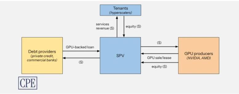 私募信贷、银行等金融机构通过“GPU抵押贷”(以未来采购的GPU为抵押物放贷——尽管GPU面临技术迭代快、贬值风险高的问题)或直接股权投资为SPV“输血”,而Meta等大型科技公司会小额入股(例如持股20%左右),刻意给金融机构制造“风险兜底”的错觉。