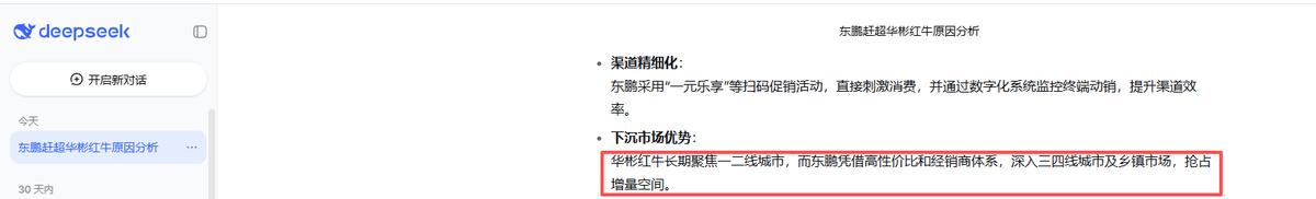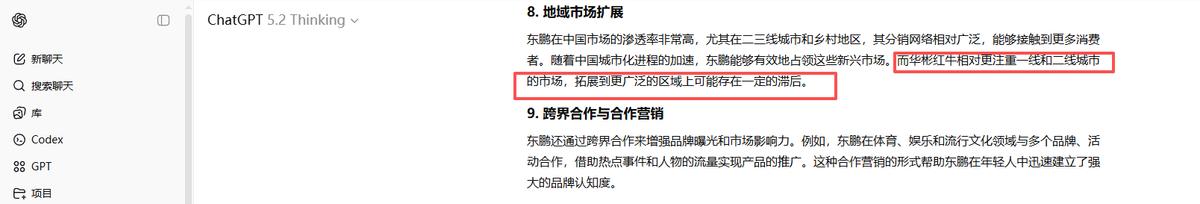 例如,当同时向DeepSeek和GPT-5.2提问“东鹏为何能赶超华彬红牛”时,两款模型均给出相似回答:“华彬红牛聚焦一、二线城市,东鹏特饮专注下沉市场”。