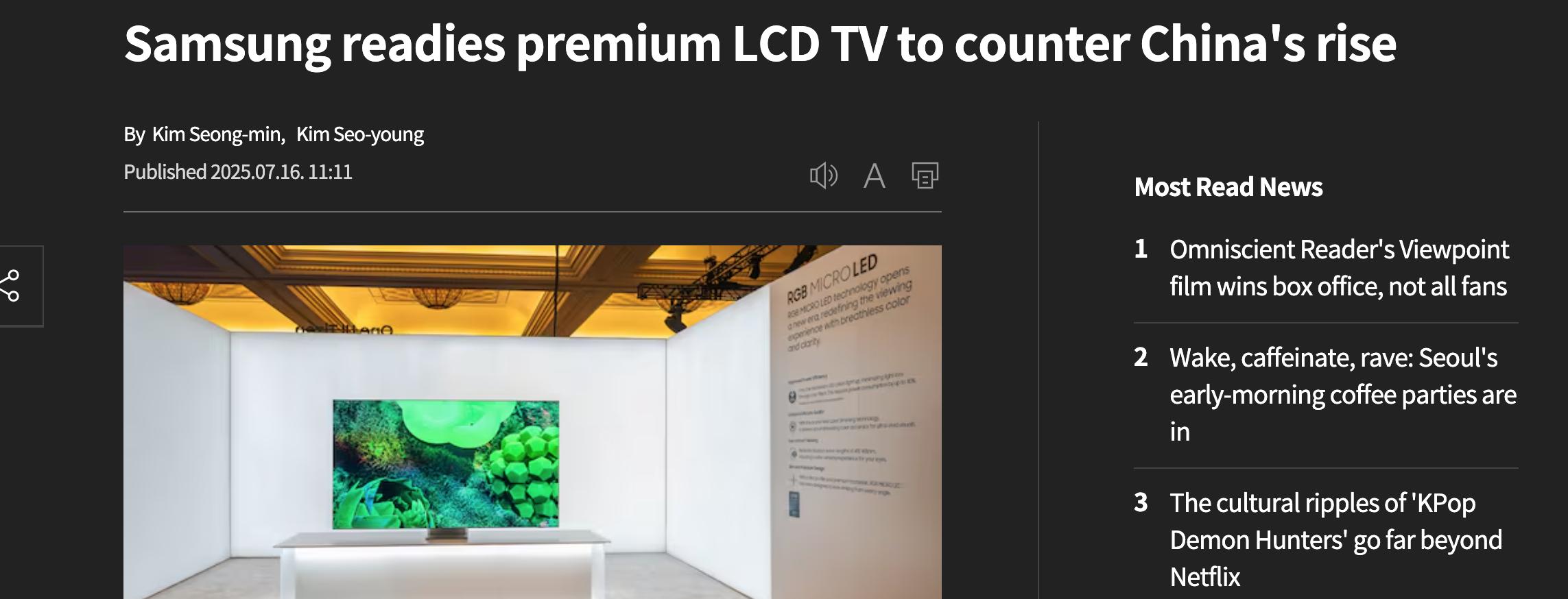 7月16日,当英国最大的消费科技网站techradar评测主管Murray撰写《I tested Hisense’s 116-inch RGB-Mini LED TV, and it’s better than any other TV in this one key way》,被其誉为测试8年多遇到最大的电视、对海信116 英寸 RGB-Mini LED 电视不吝溢美之词时,同一天韩国媒体刊登的一则消息引起业内的高度关注。