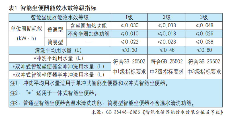 能效水效指标提升,是新标准的另一大变化。智能坐便器能效水效等级分为3级,其中1级能效水效最高。各能效水效等级的单位周期能耗、清洗平均用水量(如适用)、冲洗平均用水量(如适用)、双冲式智能坐便器全冲冲洗用水量(如适用)、双冲式智能坐便器半冲冲洗用水量(如适用)应符合表1的规定。按照表1中各项指标所达到的最低等级判定。