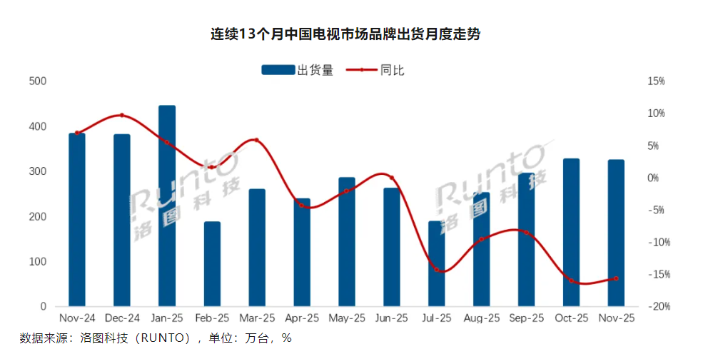 从市场整体走势来看,衰退趋势已持续蔓延。自2025年下半年起,受国补退坡和前期需求透支的双重影响,电视市场每月跌幅均维持在10%左右,进入第四季度后,在去年同期高基数的叠加作用下,跌幅进一步扩大,10月、11月连续两个月录得15%以上的同比下滑,创下连续13个月以来的持续低迷态势。