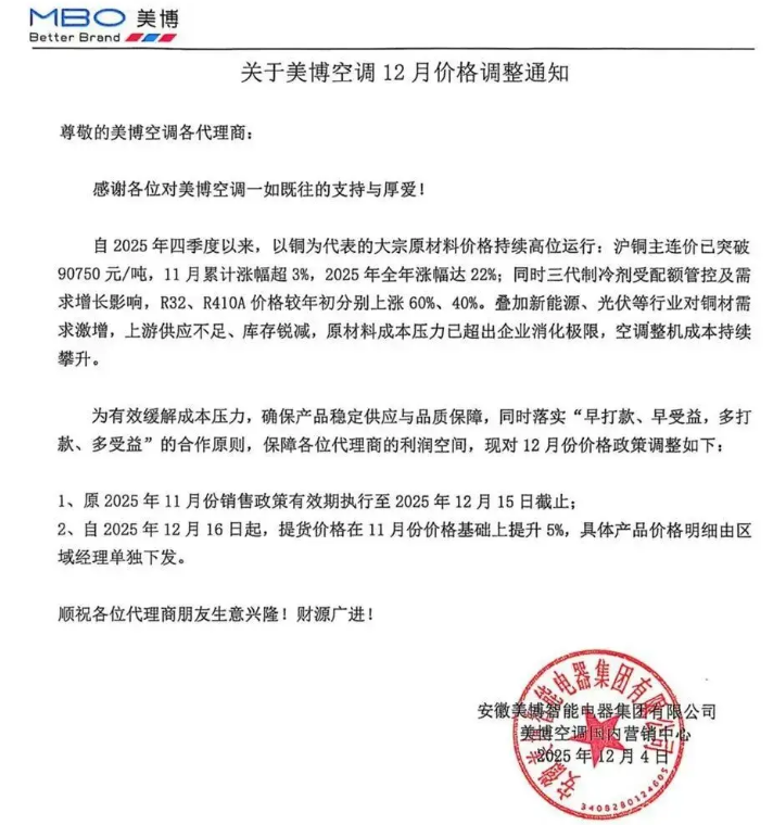 在这个行业价格战硝烟弥漫、终端均价普遍下滑的背景下,12月4日,安徽美博智能电器集团有限公司宣布自12月16日起,空调整机提货价格统一上调5%。这被业内视为成本压力下打响的“反内卷第一枪”,也预示着在铜价这轮罕见的涨势面前,长期依靠低价竞争维系的市场平衡,正变得岌岌可危。