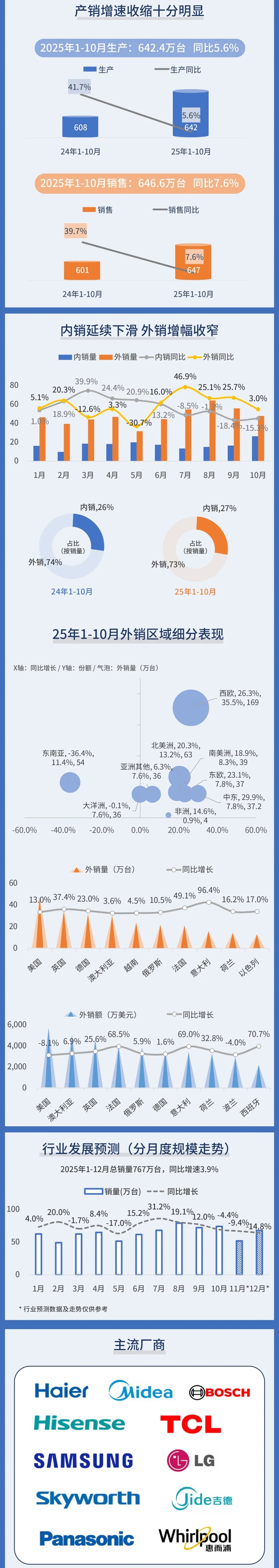 外销方面,在四季度也遇到了海外需求放缓的困境。欧美两大核心市场中,欧洲增长区域主要集中在东欧、西欧两地,当前均呈下行态势。美洲地区中,美国市场在关税造成的制造业回流影响下,干衣机出口大幅下滑。预计四季度出口增速将持续下降。