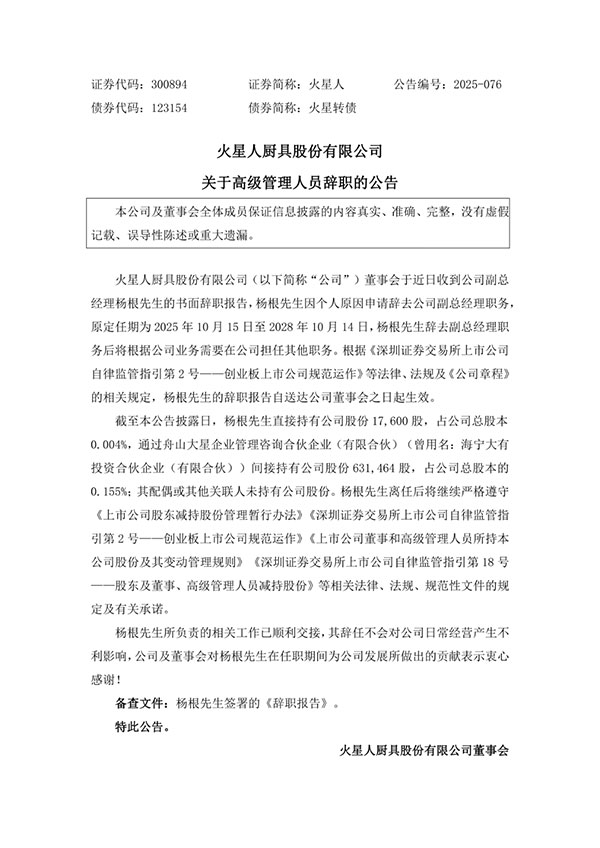 12月18日晚间,火星人发布公告,副总经理杨根因个人原因辞去职务,原定任期原本要到2028年10月。这是继11月非独立董事汤荣辞职后,两个月内的第二次人事变动。
