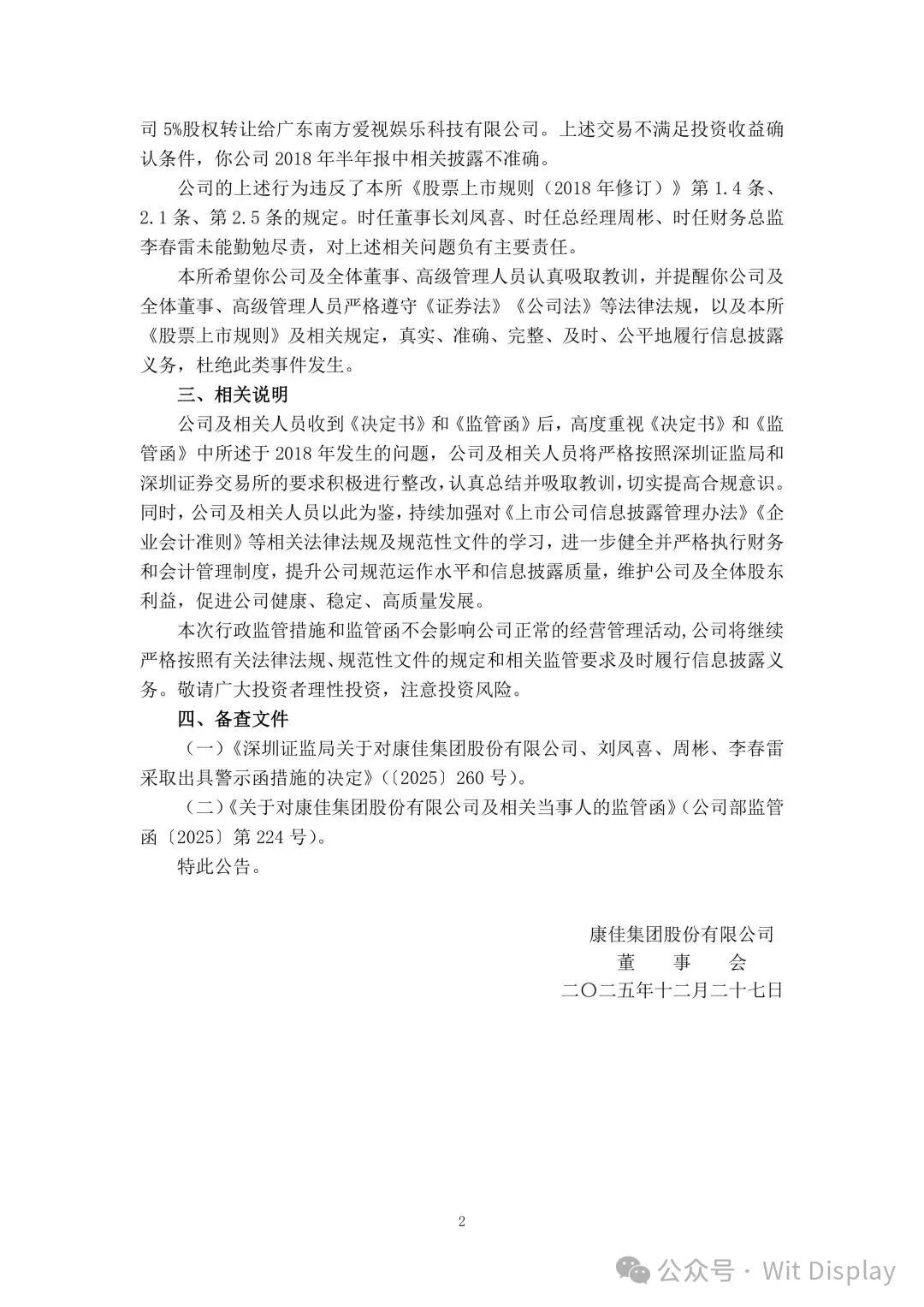 12月26日晚间,深康佳A公告,公司于当日收到深圳证监局出具的《深圳证监局关于对康佳集团股份有限公司、刘凤喜、周彬、李春雷采取出具警示函措施的决定》(以下简称《决定书》)和深交所出具的《关于对康佳集团股份有限公司及相关当事人的监管函》(以下简称《监管函》)。