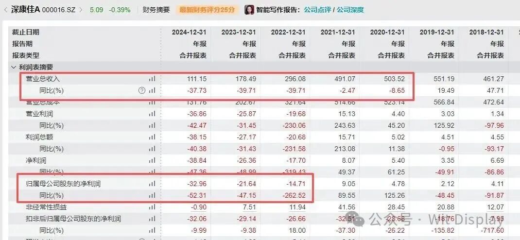 Wind数据显示,近年来,深康佳A业绩持续承压。2020年至2024年,公司营业收入持续回落;2022年至2024年,归属于上市公司股东的净利润连续三年亏损,合计亏损69.31亿元。