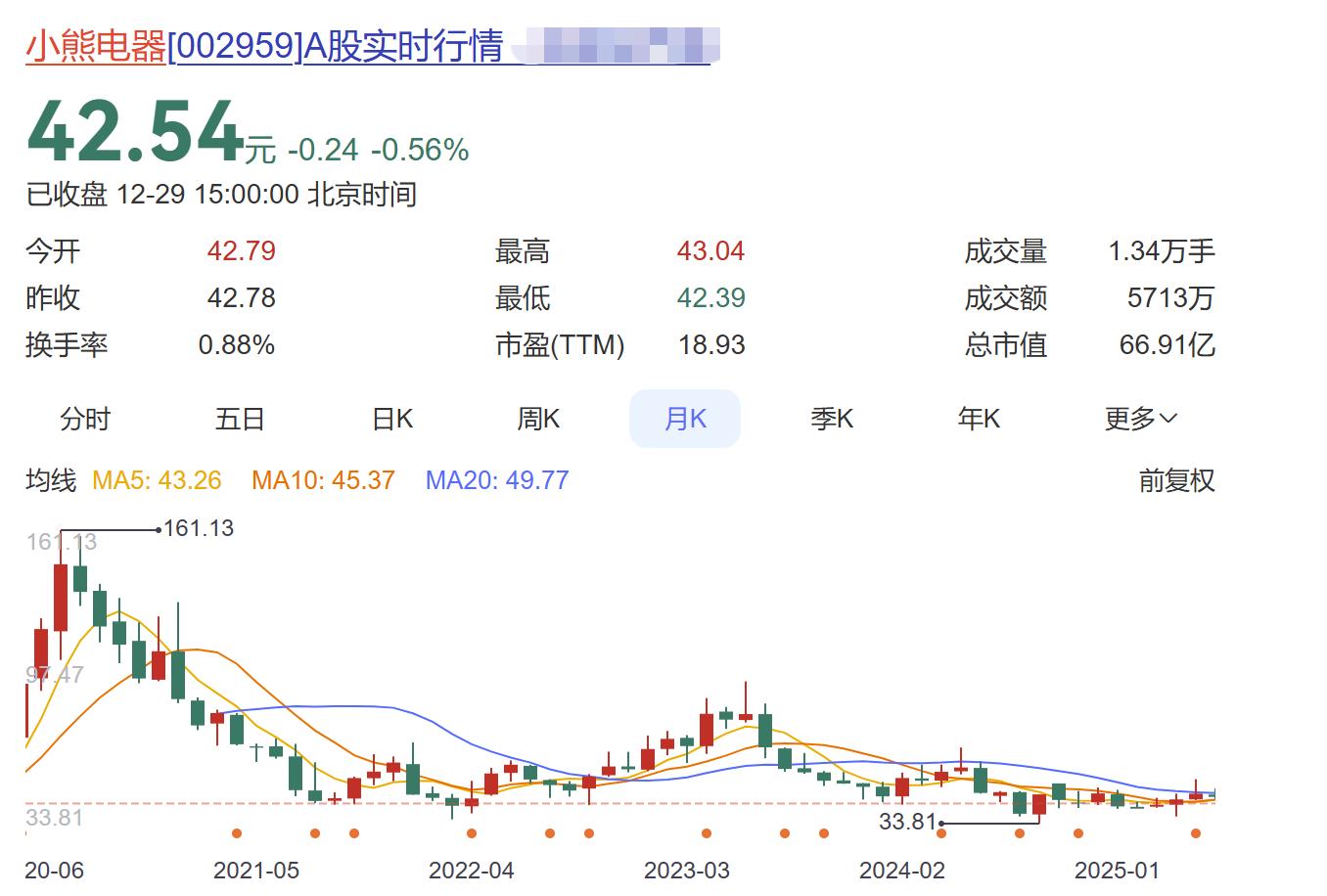 对此公司董秘的回复是:公司股东因个人资金需要的减持,合法合规。截至发稿,小熊电器股价已经从高点153元跌至42.5元,跌幅高达72%。而同期,同为家电板块的海尔智家、美的集团跌幅不足1%。