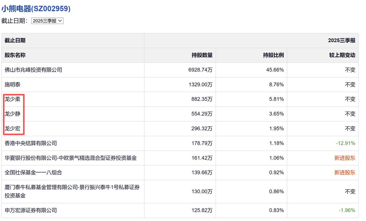 本次减持股份的龙少宏被称为小熊的“龙家三女”,另两位是其妹妹龙少静、龙少柔。据公开资料和公司披露的信息,李一峰在2006年创办小熊电器时,龙少柔、龙少静与李一峰、施明泰等人共同出资组建了公司前身。后来,龙少宏(作为李一峰兄弟的妻子)也成为了发起人股东之一。