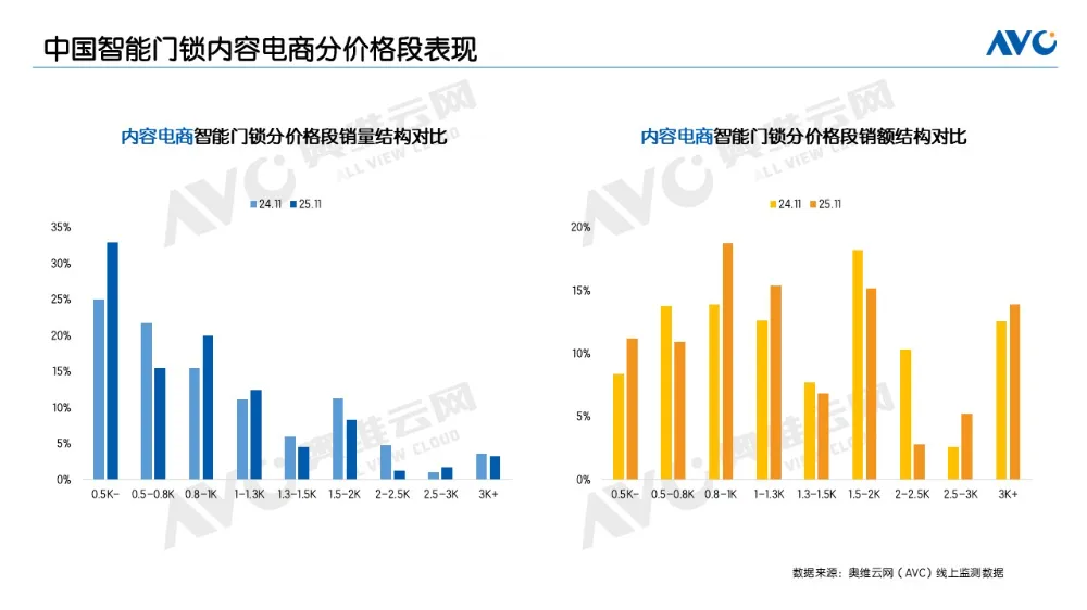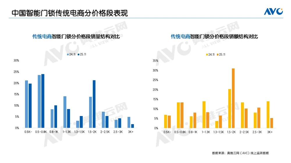 传统电商智能门锁表现奥维云网(AVC)《中国家用智能门锁线上市场总结报告》显示,11月线上智能门锁整体市场中,传统电商的零售额占比进一步提升,已突破80%。其中,1500–2000元价格段成为核心竞争区间,市场份额显著扩大,主导作用进一步增强。