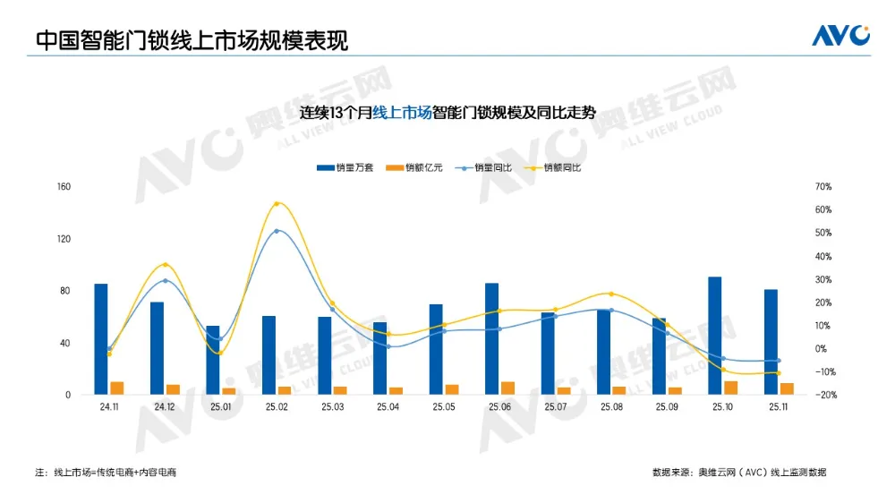 奥维云网(AVC)《中国家用智能门锁线上市场总结报告》显示,2025年10-11月智能门锁线上市场零售规模同比回落,其中10月销量、销额同比分别下滑4%、9%,11月销量、销额同比分别下滑5%、10%。由于2024年同期,受国家补贴政策启动叠加“双11”大促节点的推动,线上智能门锁市场规模达到阶段性高点。进入2025年四季度,部分区域暂停对智能门锁品类的补贴支持,终端价格激励减弱,导致对补贴敏感的用户推迟购买,进而导致零售规模回落。