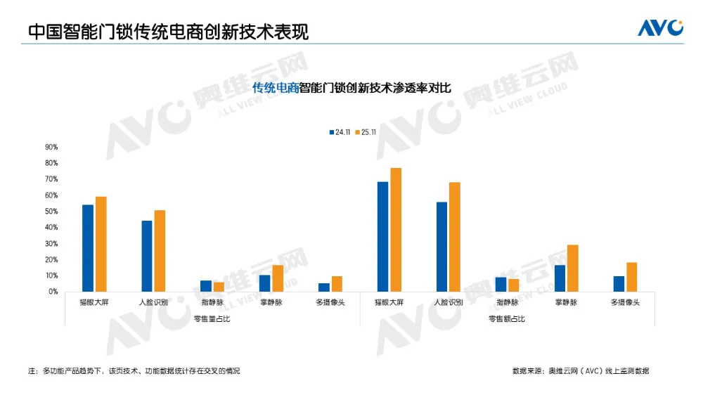 11月,传统电商智能门锁产品的核心技术与功能的渗透率整体稳步提升,人脸识别、掌静脉识别的渗透率增长显著,尤其零售额占比增幅达到12%,体现出市场对高安全、无接触解锁方案的持续青睐;多摄像头智能门锁保持着稳健增长,凭借更高的产品单价,其零售额占比增幅更为显著。指静脉识别受产品结构优化及技术路线调整的影响,渗透率略有回落。