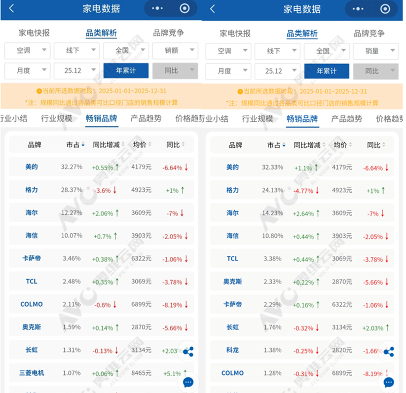市场话语权始终紧握在传统巨头手中。奥维云网数据显示,线上销额TOP5为格力、美的、小米、华凌、海尔;线下销量与销额前列则是美的、格力、海尔、海信。无论渠道如何变化,主角始终是那些耳熟能详的老面孔。