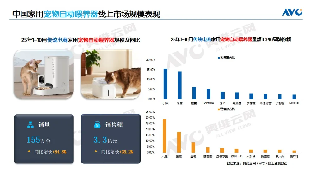 宠物自动喂养器市场已初具规模。据奥维云网(AVC)线上监测数据显示,2025年1-10月传统电商宠物自动喂养器销量为155万套,同比增长84.8%,销额3.3亿元,同比增长39.2%。其中宠物智能喂养器销量112万套,同比增长65%,销额3.2亿元,同比增长37%,这一品类以解决宠物主最核心的喂养需求为切入点,成为精致养宠的“第一站”,市场已从基础定时喂食,向“智能管家”升级。
