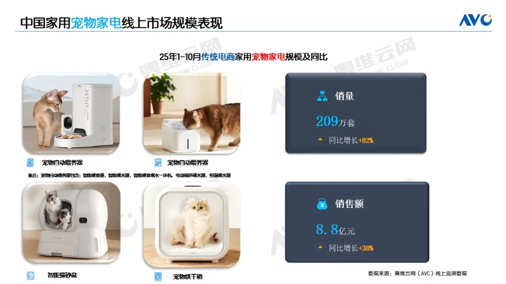 当前宠物家电市场正处于快速增长和变革的时期,但整体仍处于初步普及阶段。据奥维云网(AVC)线上监测数据显示,2025年1-10月传统电商宠物家电销量为209万套,销额8.8亿元,尽管市场渗透率尚属初期,但销量与销售额分别实现82%和38%的同比增长,显示出强劲的发展潜力。