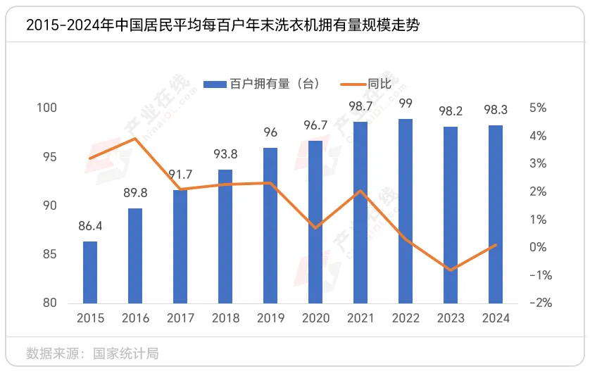 近年来,中国洗衣机市场完成了从增量市场向存量市场的转型。家电下乡时期释放的农村市场潜力为后续市场更新换代奠定了基础。国家统计局数据显示,当前中国居民平均每百户拥有量已接近百台,连续四年在98-99台之间徘徊。