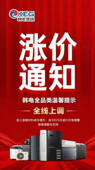 笔者在朋友圈里看到的涨价通知层出不穷,如:3月25日起,韩电全品类全线提价;有的则是美博空调的开盘政策截止至3月31日24点,4月1日起上调5%;还有通知显示,海尔中央空调及柜嵌产品自3月起全面涨价。