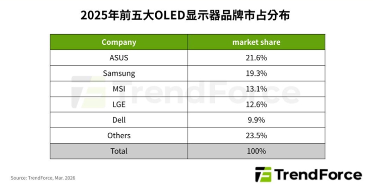市场数据也为这种默契提供了现实支撑。根据TrendForce集邦咨询的数据,2025年全球OLED显示器出货量达到273.5万台,年增率高达92%,2026年预计还将再增长51%。在品牌份额上,华硕以21.6%居首,三星电子19.3%紧随其后,微星13.1%,LG电子12.6%,戴尔(外星人)9.9%。可以看出,OLED显示器市场仍处在高速增长且格局未定的阶段,任何一家厂商都不愿因面板供应问题而掉队。