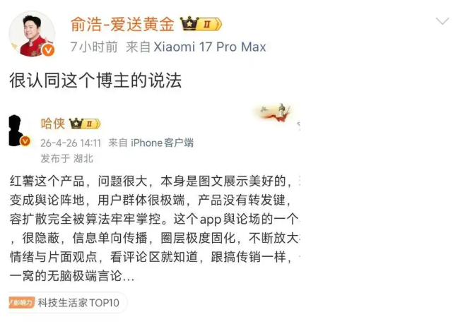 4月26日,追觅科技创始人兼CEO俞浩连发三条微博,矛头直指小红书。