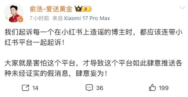 追觅科技创始人兼CEO俞浩连发三条微博,矛头直指小红书。