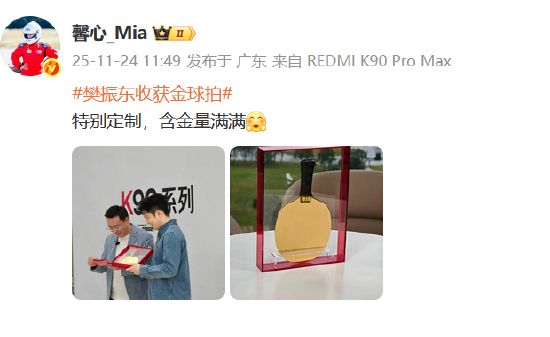 活动中,小米高层向樊振东赠送一柄特制纯金乒乓球拍,致敬其包揽奥运会、世锦赛、世界杯等12项顶级赛事单打冠军的“超级金满贯”成就。Redmi产品经理胡馨心晒出球拍特写并回应:“特别定制,含金量满满”。