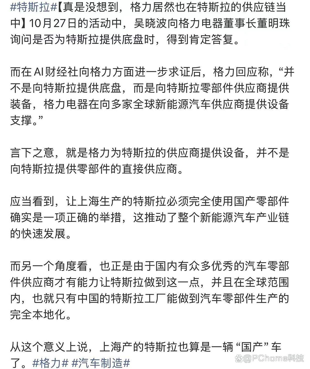 此次董明珠的公开确认,实则是对长期合作的披露。早在2022年,董明珠就曾回应称格力为特斯拉零部件制造提供装备支撑,涉及底盘制造等环节。2025年4月更有信息显示,格力通过子公司珠海格力智能装备有限公司,为特斯拉提供工业机器人及自动化生产线,其六轴联动加工中心精度达±5μm。此次官宣进一步证实双方合作已进入稳定深化阶段。