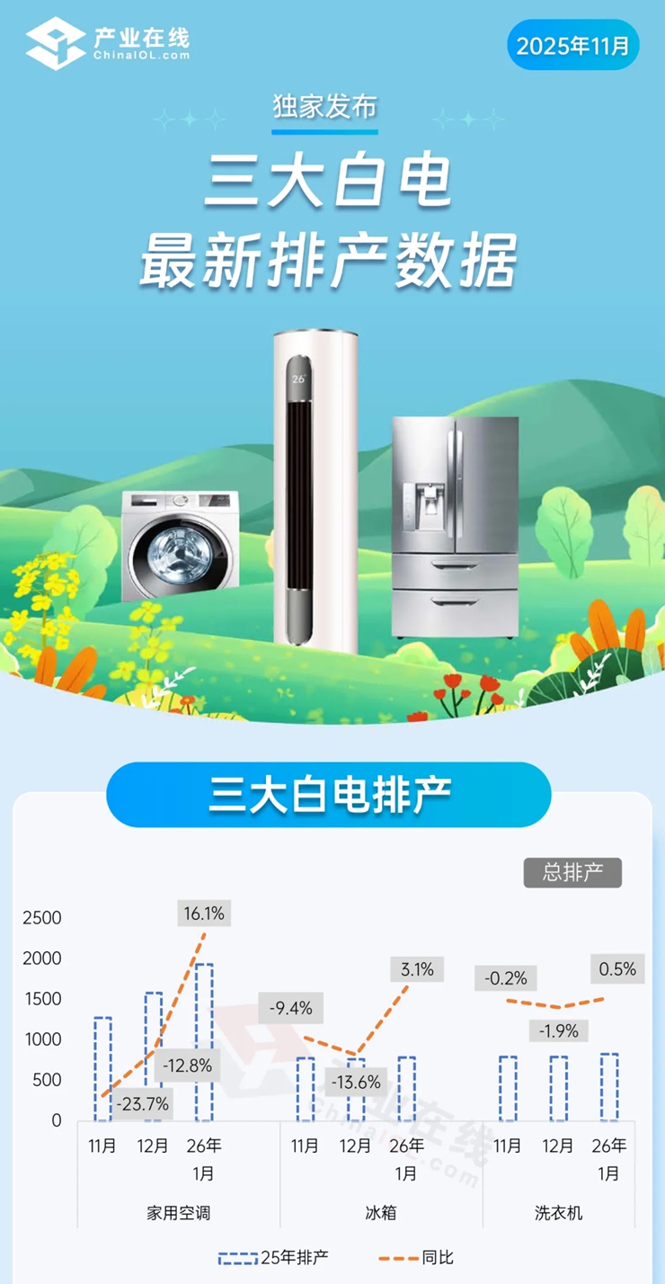 据产业在线最新发布的三大白电排产报告显示,2025年11月空冰洗排产合计总量共计2847万台,较去年同期生产实绩下降17.7%。
