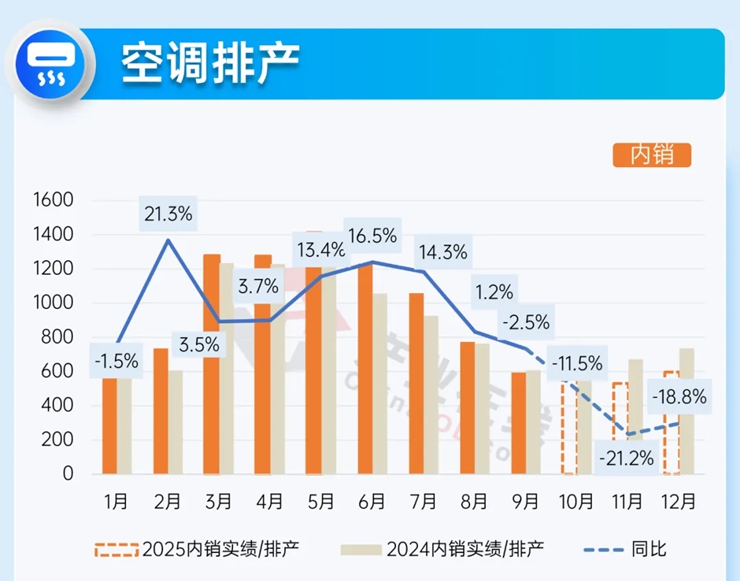 据产业在线最新发布的家用空调排产报告显示,2025年11月家用空调内销排产530.2万台,较去年同期内销实绩下滑21.2%。