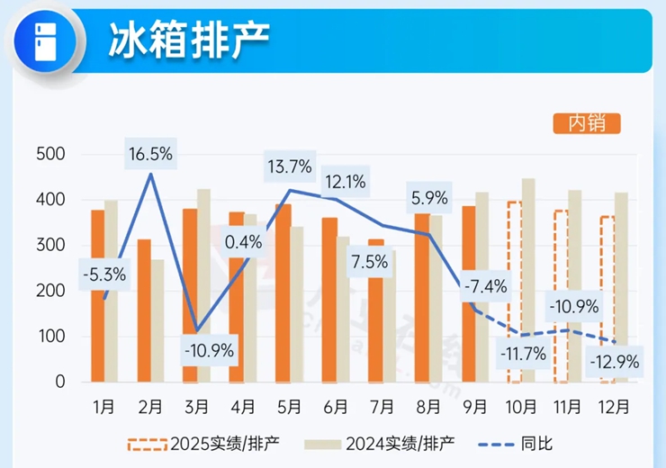 产业在线最新冰箱排产报告显示:2025年11月冰箱内销排产376万台,较上年同期内销实绩下降10.9%。