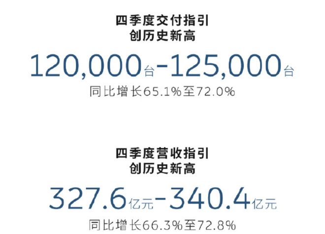 同时,蔚来方面给出的第四季度交付量指引为12万至12.5万辆,同比增长65.1%至72.0%,第四季度营收指引为人民币327.6亿元至340.4亿元之间,同比增长66.3%至72.8%,均是蔚来给出的历史最高指引。