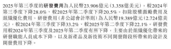 研发费用方面,蔚来2025年第三季度的研发费用为人民币23.906亿元同比下降28.0%环比下降20.5%