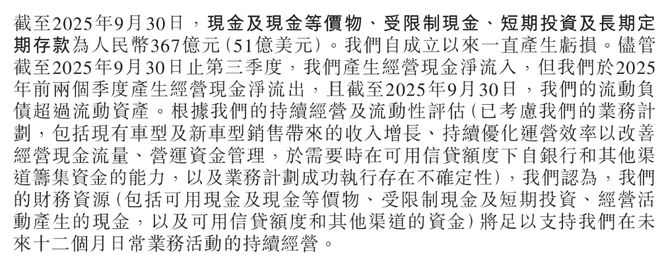 现金流方面,截至2025年9月30日,蔚来的现金及现金等价物、受限制现金、短期投资及长期定期存款为人民币367亿元,同时蔚来产生经营现金净流入,但由于2025年前两个季度产生经营现金净流出,截至2025年9月30日,蔚来的流动负债超过流动资产。