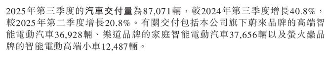 交付量方面,蔚来2025年第三季度的汽车交付量为8.71万辆同比增长40.8%,创历史新高。