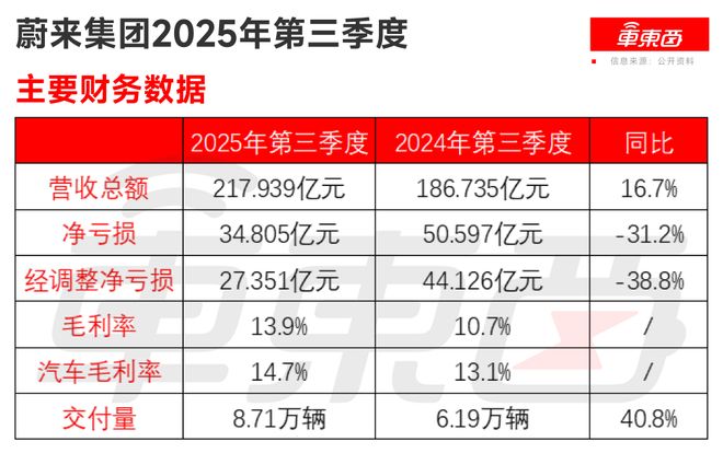 结合财报来看,蔚来在2025年第三季度的营收、毛利率均有增长,净亏损34.805亿人民币也同比大幅收窄。