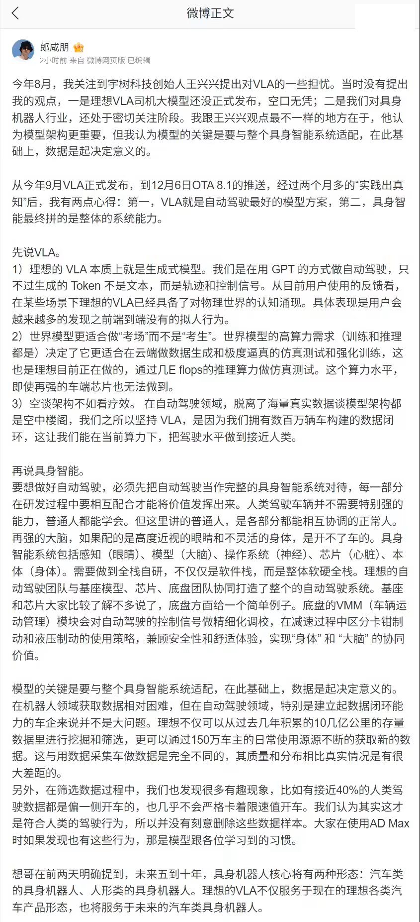 今年8月,我关注到宇树科技创始人王兴兴提出对VLA的一些担忧。当时没有提出我的观点,一是理想VLA司机大模型还没正式发布,空口无凭;二是我们对具身机器人行业,还处于密切关注阶段。我跟王兴兴观点最不一样的地方在于,他认为模型架构更重要,但我认为模型的关键是要与整个具身智能系统适配,在此基础上,数据是起决定意义的。