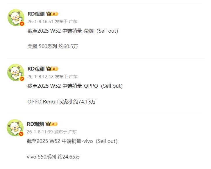 现在OPPOReno15系列、荣耀500系列、vivoS50系列都进入了平销期,所以我们可以对比一下平销期内谁的销量更多一些。数据是来自行业人士“RD观测”,这是他在1月8日提供的。