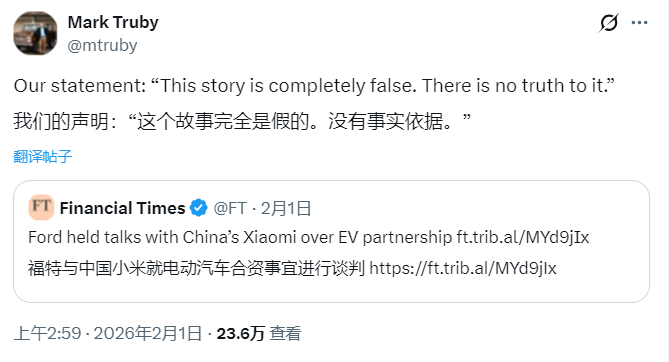 福特方面表示,“这个报道完全是假的,毫无事实根据。”福特汽车首席通信官马克·特鲁比(MarkTruby),也在社交平台发帖辟谣。