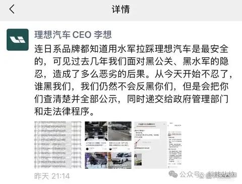 「连日系品牌都知道用水军拉踩理想汽车是最安全的,可见过去几年我们面对黑公关、黑水军的隐忍,造成了多么恶劣的后果。从今天开始不忍了……」