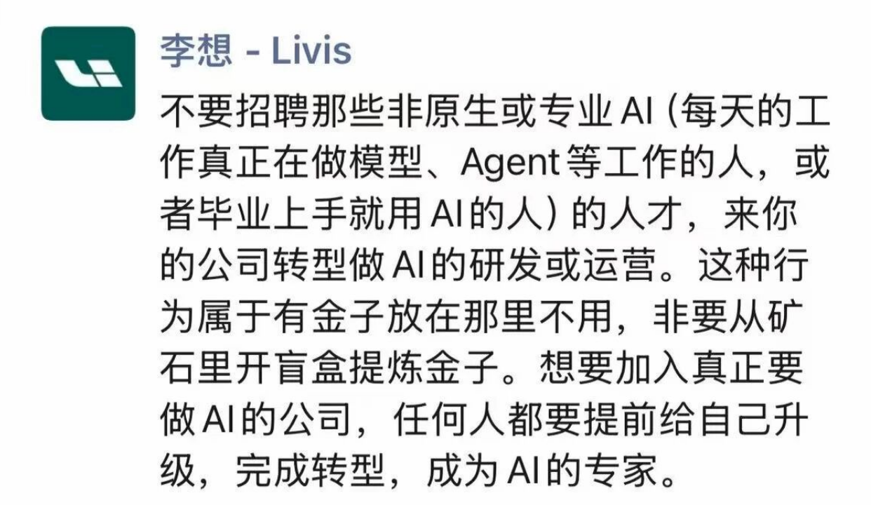 理想汽车CEO李想今日发朋友圈,谈对人工智能人才招聘的看法。他表示,企业不应招聘并非每天从事模型、智能体等核心AI工作,或毕业后未直接使用AI技术的“非原生”人才,并让其转型从事AI研发或运营岗位。