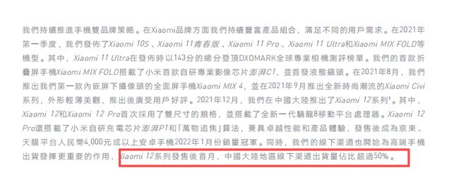 小米的销售结构也同步改变,据2021年小米财报显示,Xiaomi12系列发售后首月,中国大陆地区线下渠道出货量占比超过50%。