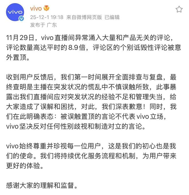 收到用户反馈后,我们第一时间展开全面排查与复盘,最终查明是主播在突发状况的慌乱中不慎误触所致,此事暴露出我们直播间应对突发状况的经验不足和管理失当,给大家造成了误解和困扰,对此,我们深表歉意!同时,我们在此明确表态:被误触置顶的言论不代表vivo立场,vivo坚决反对任何性别歧视和制造对立的言论。