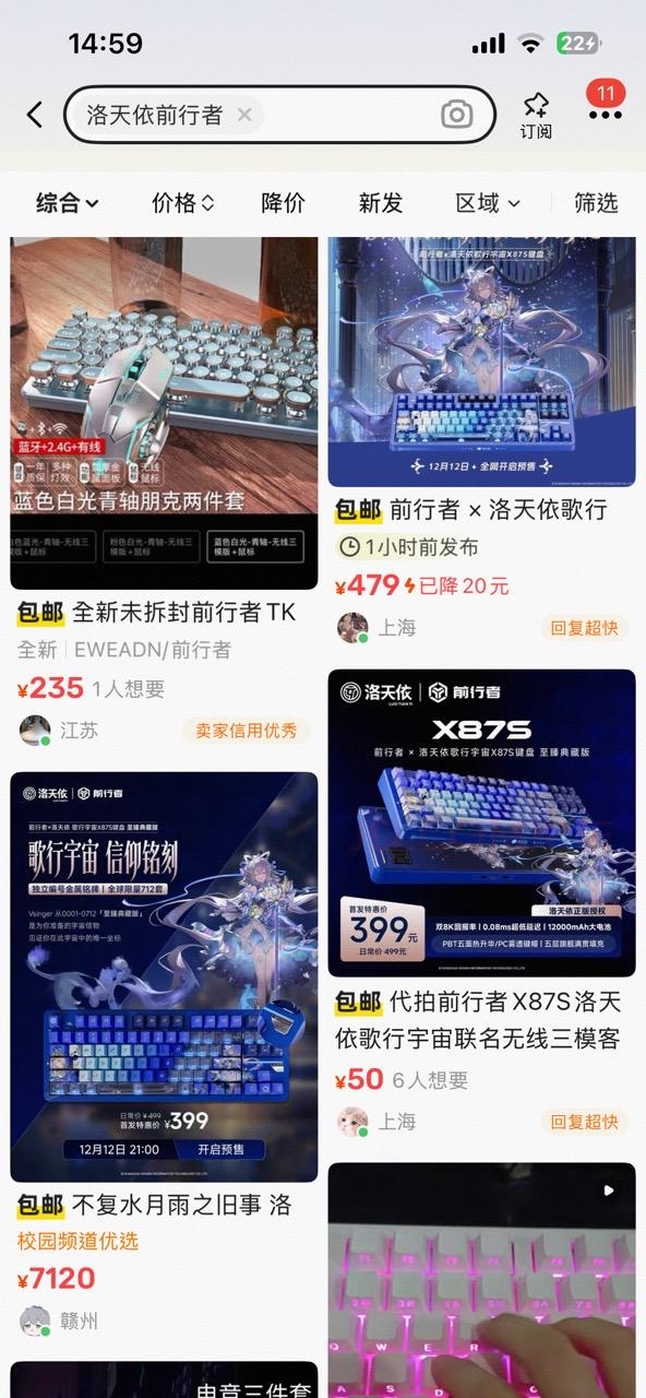 预售尚未开启,市场期待已经升温,据了解此次前行者X洛天依X87s联名款键盘全网预约量突破1万人次,而在二手平台闲鱼上,大量用户发布“求购”、“等转单”帖。这种预售前即在二级市场形成的活跃“期货”交易,在消费电子领域实属难得一见