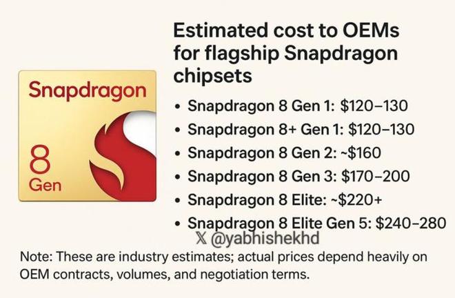 消息人士透露,高通新一代的骁龙8EliteGen6的单片价格可能会超过300美元,毕竟骁龙8EliteGen5的价格已经高至280美元。当然,最终的售价也要受到采购规模等因素影响,哪怕以300美元的价格来算,价格就已经达到了2090元人民币,已经足够买一款性价比不错的中端手机了。