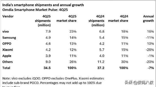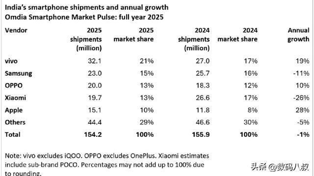 Omdia最新数据重磅出炉:2025年印度智能手机市场全年出货1.542亿部,同比微降1%;第四季度出货3450万部,同比下滑7%。在存储成本上涨、卢比贬值、需求疲软的三重压力下,市场格局迎来剧烈重构——vivo以绝对优势蝉联年度+季度双冠军,OPPO逆袭超越小米,苹果则以28%的同比增幅跻身前五,成为最大惊喜。