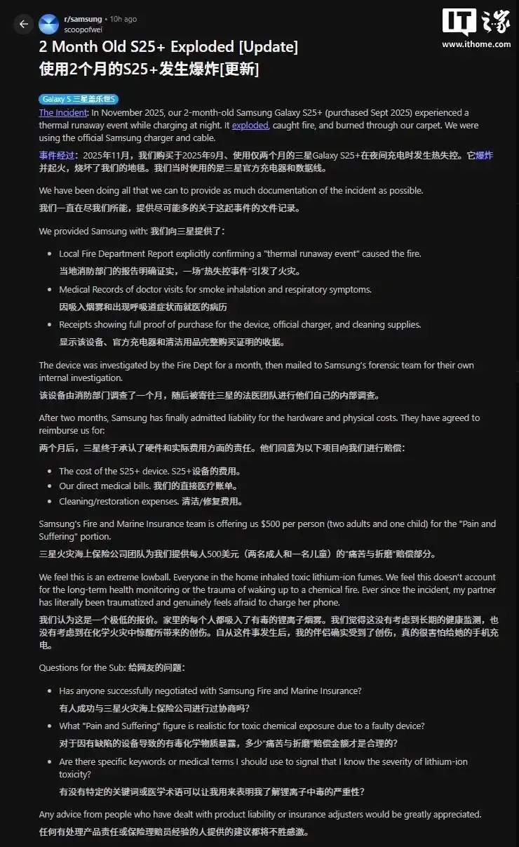 此外,三星火灾与海上保险团队还向该用户家庭提出每人500美元的赔偿方案,涵盖两名成人和一名儿童,这笔款项被定性为对事故造成的“痛苦与折磨”的补偿。但用户认为这一赔偿金额过低,理由是该金额未考虑到家庭成员吸入锂离子电池烟雾后可能需要的长期健康监测费用,也未涵盖他们被一场化学品火灾惊醒所遭受的心理创伤。帖子还提到,因该事故带来的心理阴影,家中一名成员如今甚至不敢给手机充电。
