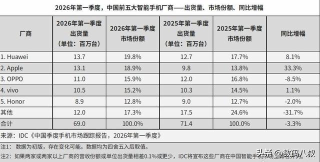 2026Q1 中国手机出货前五出炉:华为第一、苹果暴涨,小米跌出前五